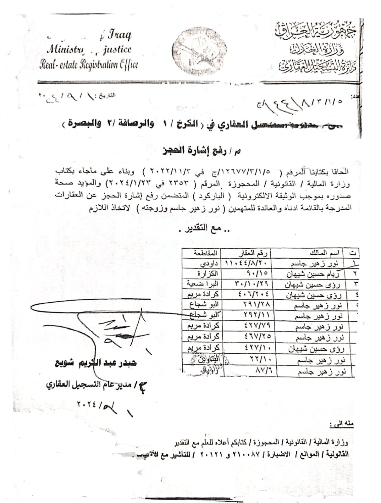 حصلت “الاقتصاد نيوز”، الاربعاء، على وثيقة رسمية صادرة عن : مديريات التسجيل العقاري الكرخ 1 والكرخ 2 والبصرة ترفع الحجز عن حرامي سرقة القرن نور زهير وزوجته..