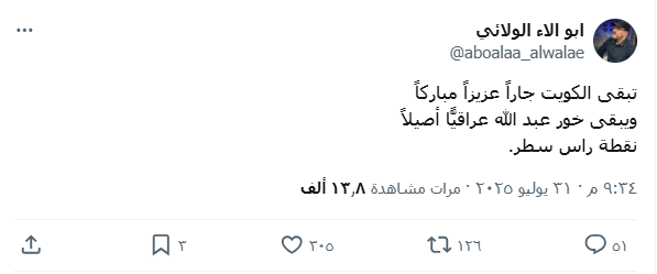 قال الأمين العام لحركة “سيد الشهداء”، أبو آلاء الولائي، في منشور عبر منصة “إكس”، إن الكويت ستبقى جاراً عزيزاً مباركاً، مؤكداً في الوقت ذاته أن خور عبد الله “عراقياً أصيلاً”، وذلك في ظل الجدل المتصاعد بشأن الممر البحري الحيوي.