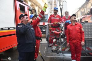 لتعجيل السيطرة على الحريق، تم زج عجلات سلمية لمكافحة النيران في الطوابق العليا بالتزامن مع تنفيذ عمليات الاقتحام المباشر والدخول إلى قلب البناية المحترقة.