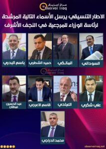 كشف مصدر مطلع ان الاطار التنسيقي ارسل اسماء مرشحيه لمنصب رئيس الوزراء القادم إلى المرجعية الدينية في النجف الأشرف.
