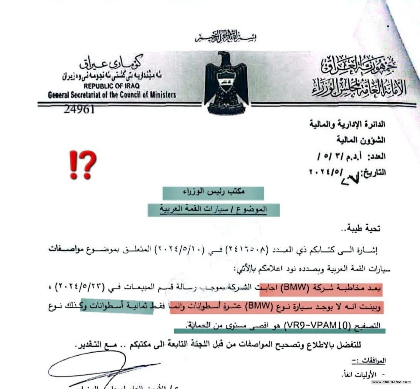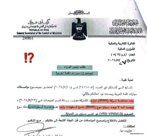 نشر النائب محمد جاسم الخفاجي وثيقة صادرة عن الامانة العامة لمجلس الوزراء عن طلبات الحكومة لمستلزمات القمة العربية الاخيرة في بغداد، مشيراً الى أنها طلبت من شركة بي أم دبليو، سيارات كلفتها 10 مليار دينار عراقي. ووفق تدوينة للنائب، ورصدتها “المطلع”، فإنه “بمناسبة بيع السيارات الحكومية، كانت كلفة شراء سيارات القمة العربية 10 مليارات دينار عراقي، لكن أين الكارثة؟ أن الحكومة طلبت مواصفات الـ BMW تكون 10 سلندر وتصفيح ليس موجوداً أصلاً؟!”. وقال النائب إن “الشركة أجابتهم بعدم وجود مواصفات كهذه”، متهكماً: “تريدون تطيرون بيها للقمر لو تدخلون اختبار تفجير نوووي؟؟!!”. وأضاف: “تلاحظون حجم المغالة والتفريط والهدر بالمال العام؟”، مبيناً أن “تكاليف الضيافة والأتكيت ليوم واحد بـ 60 مليار دينار عراقي”.