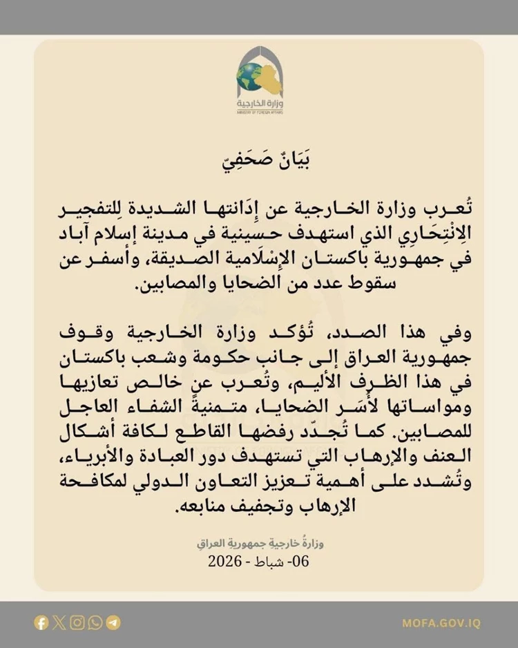 العراق يدين الجريمة الإرهابية التي استهدفت مصلين داخل مسجد في باكستان 28 يوم ago الأخبار 18 زيارة فيينا / الجمعة 06 . 02 . 2026 وكالة السيمر الاخبارية المصدر / متابعة خبرية وفق حرية الرأي والنشر يتم نشر هذه المادة والجريدة غير مسؤولة عما ينشر فيها من مواد واخبار ومقالات 2026-02-06 alsaymar شاركها Facebook Twitter Google + LinkedIn