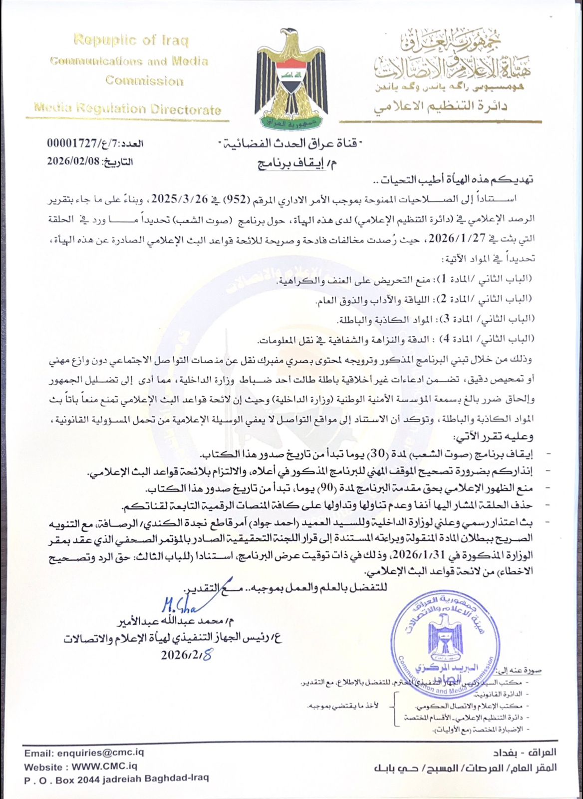 الرئيسية/الأخبار/بالوثيقة قرار هيأة الاعلام والاتصالات الصادر بحق قناة عراق الحدث تحديداً برنامج (صوت الشعب) ومقدمته الاعلامية مرة هاشم بعد تحريضها على ضابط في وزراة الداخلية.