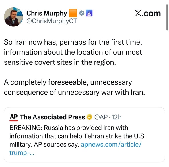 انتقد السيناتور الأمريكي كريس مورفي، اليوم السبت ( 7 آذار 2026 )، التصعيد العسكري مع إيران، معتبراً أن الحرب معها قد تقود إلى نتائج خطيرة وغير محسوبة، وذلك على خلفية تقارير عن ملاحقة طائرات مسيّرة إيرانية لمواقع يُعتقد أن قوات أمريكية تتواجد فيها في منطقة الخليج.
