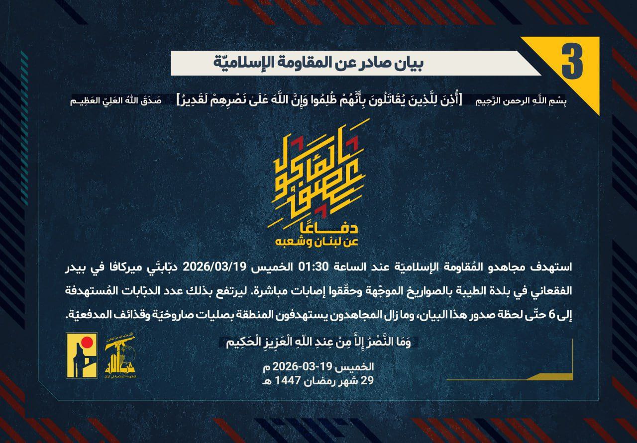 المقاومة الإسلامية حزب الله بلبنان تدمر 6 دبابات ميركافا بنداء لبيك يانصر الله ساعتين ago الأخبار 9 زيارة فيينا / الخميس 19. 03 . 2026 وكالة السيمر الاخبارية بنداء لبيك يانصر الله وصل عدد الدبابات الاسرائيلية المستهدفة بالصواريخ الموجهة للعدد 6 ببلدة الطيبة هذا اليوم… وفق حرية الرأي والنشر يتم نشر هذه المادة والجريدة غير مسؤولة عما ينشر فيها من مواد واخبار ومقالات 2026-03-19 alsaymar شاركها Facebook Twitter Google + LinkedIn